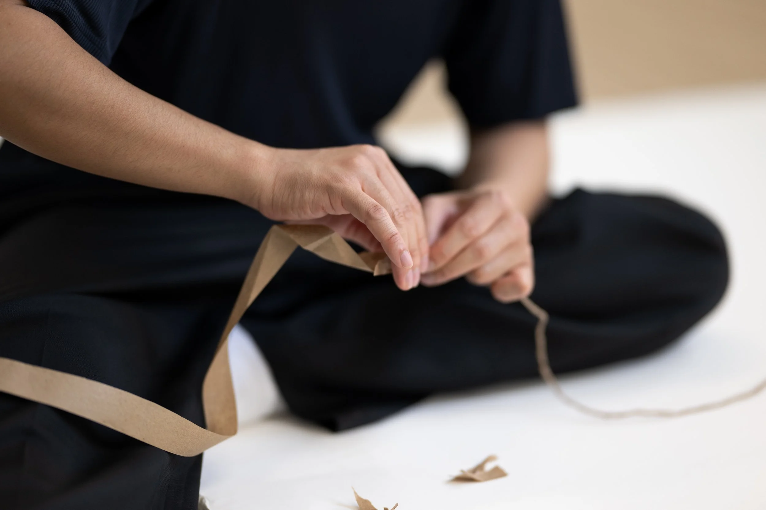 Ralph was invited to the Vancouver Art Gallery to explore this new work, through the Material MattersLab Here//Too//For in 2023. He had time to incubate my ideas and explore how to realize packing paper, inspired by his textile work PIÑA in the crafting of fibers, into a costume for a new solo work.