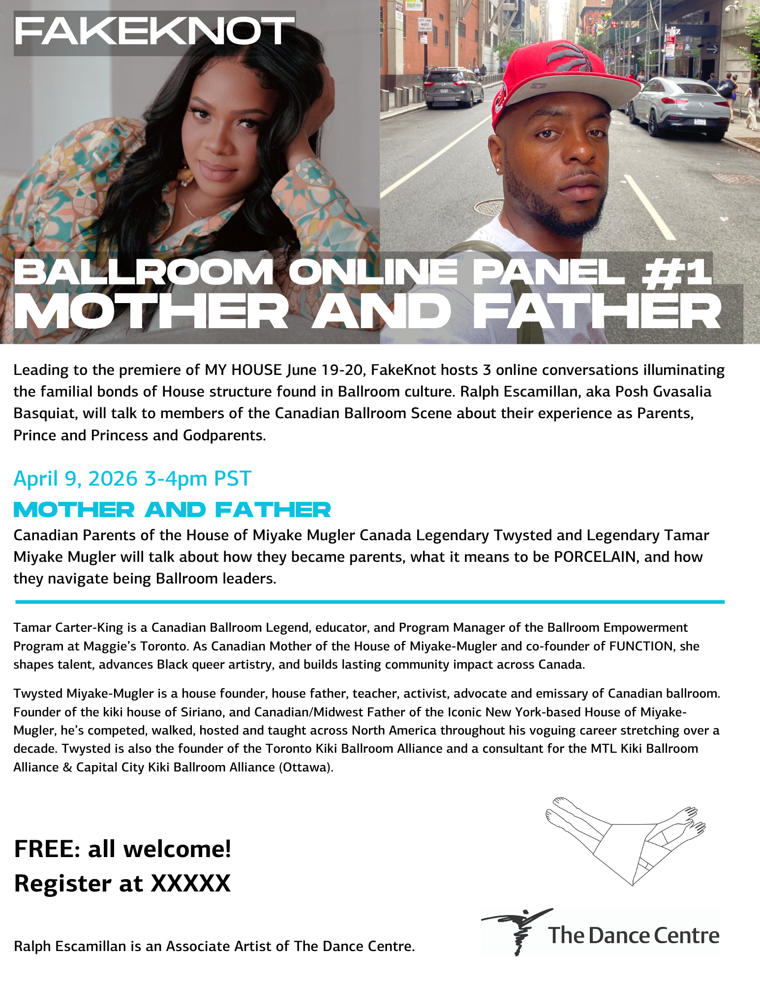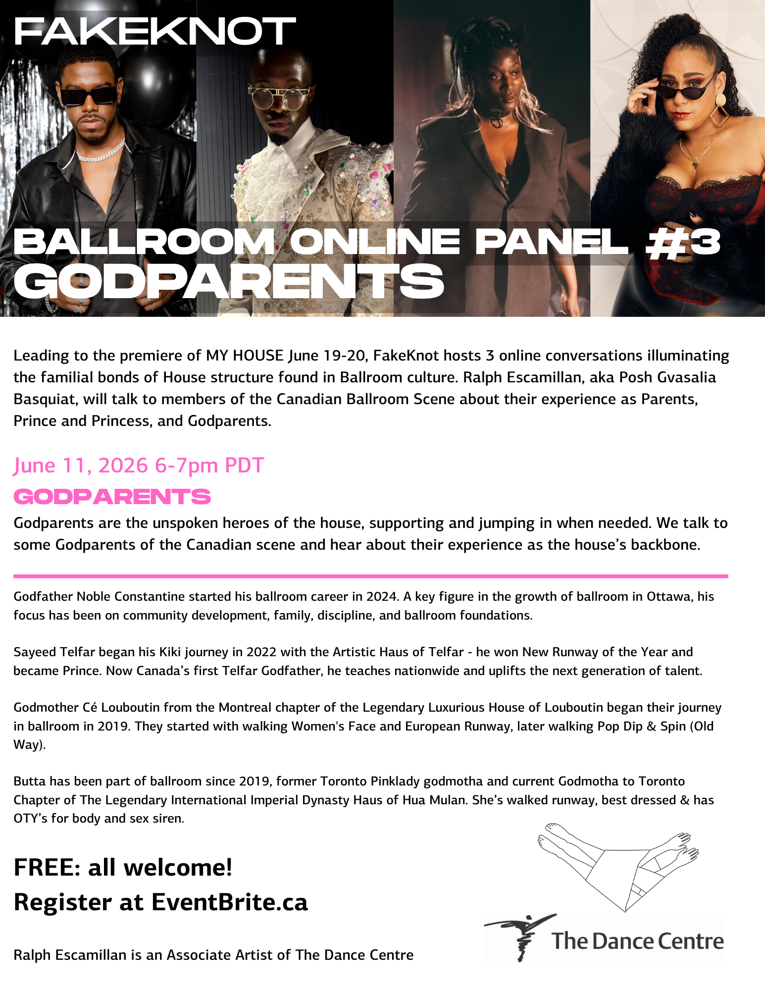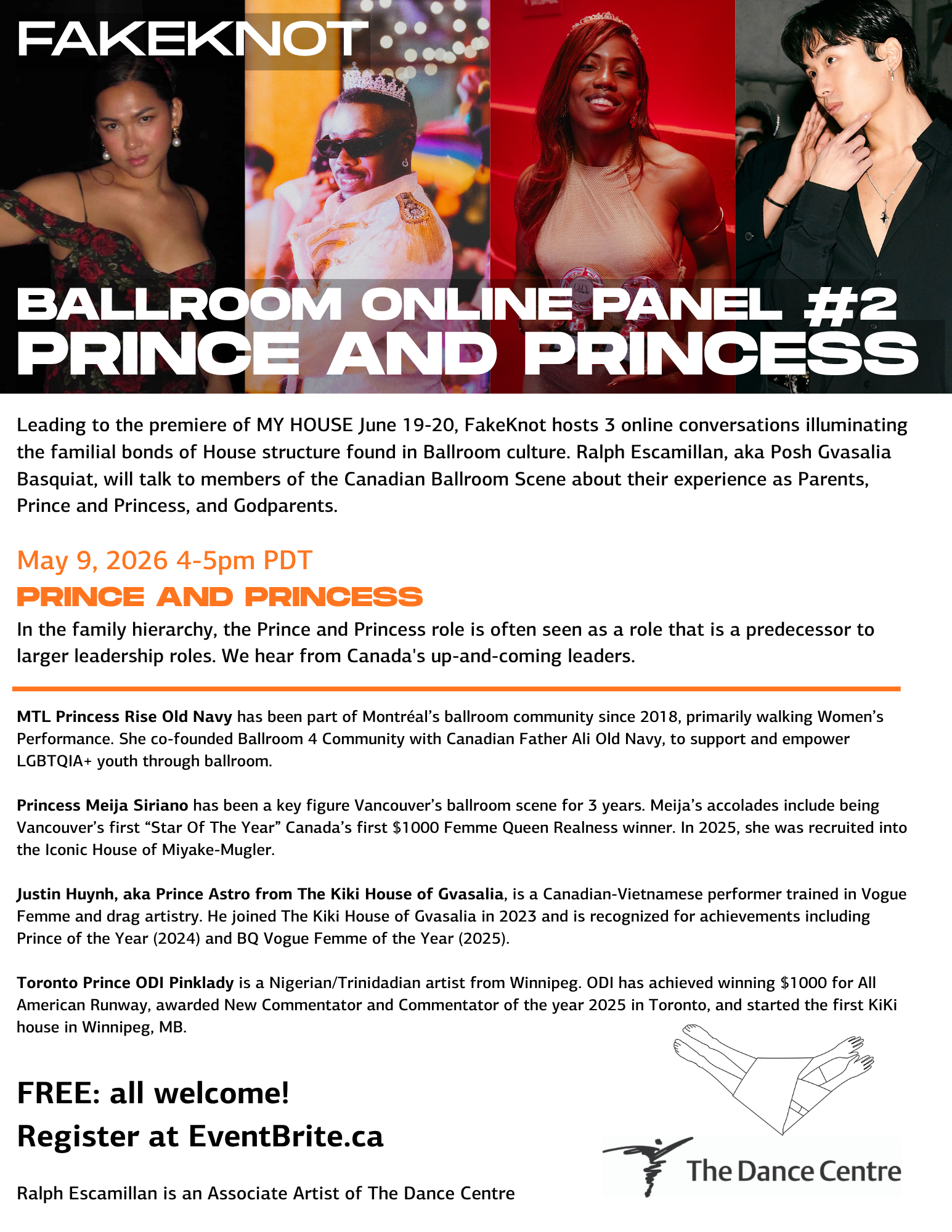 Leading to the premiere of “MY HOUSE” June 19-20, 2026, FakeKnot will be hosting 3 online conversations illuminating the familial bonds of House structure found in Ballroom culture. These online conversations hosted by Posh will talk to members of the Canadian Ballroom Scene about their experience as Parents, Prince and Princess and Godparents.