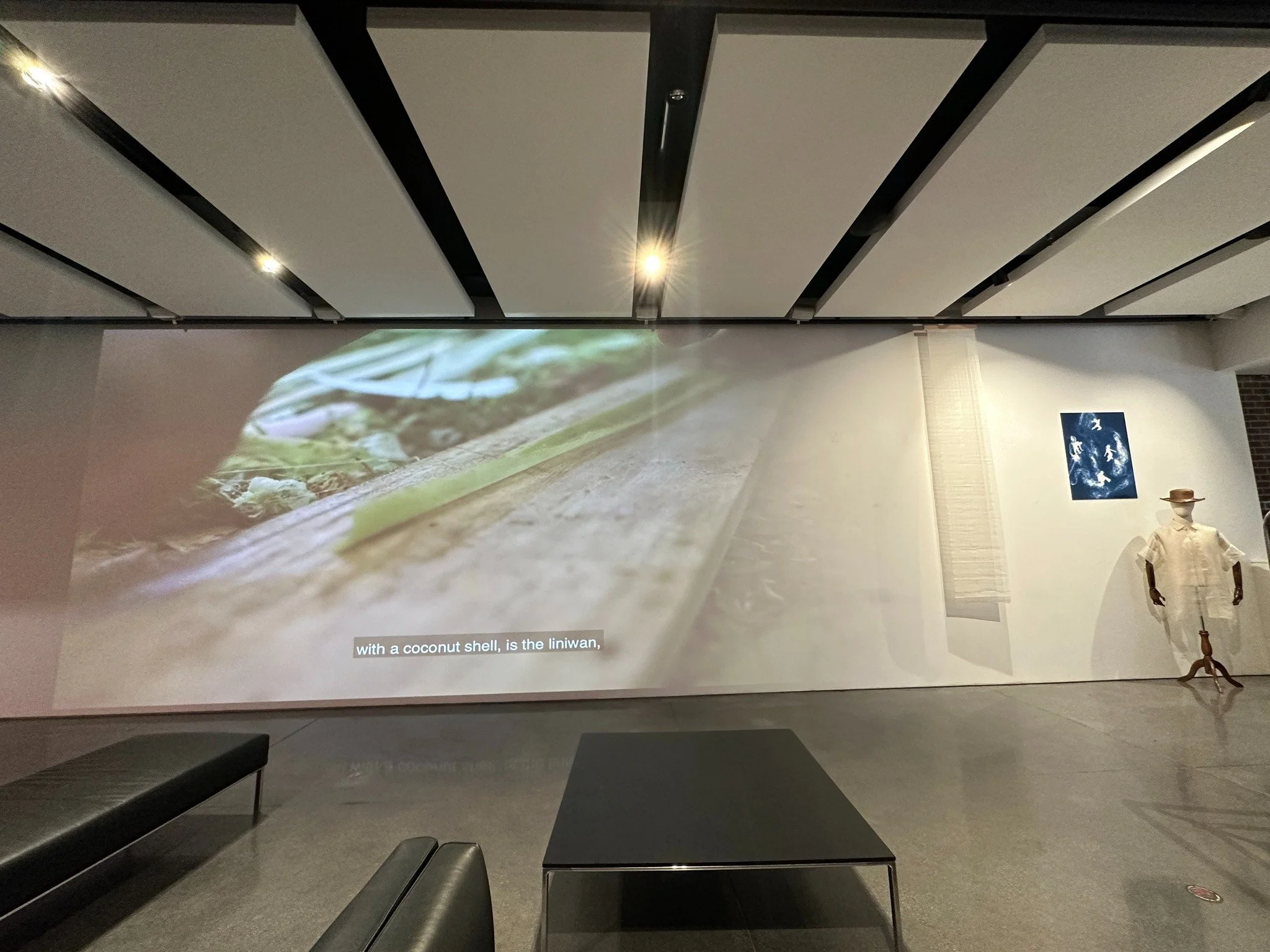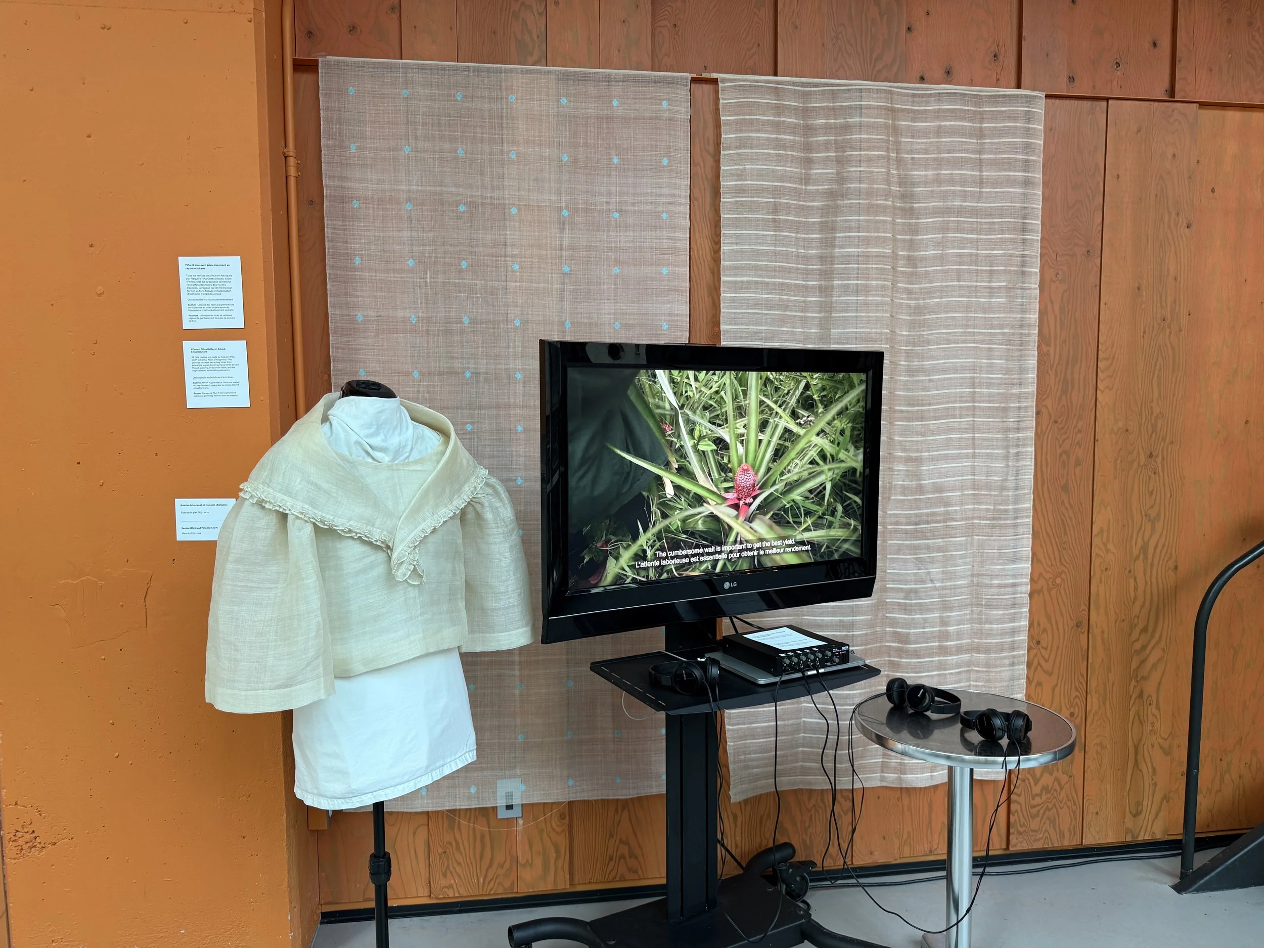 The exhibit features a documentary about piña and weavers of Raquels Piña Cloth made by Director Lune Mendoza, panels of piña fibers, a bust with either a terno or barong dress, and print out cyanotype images.